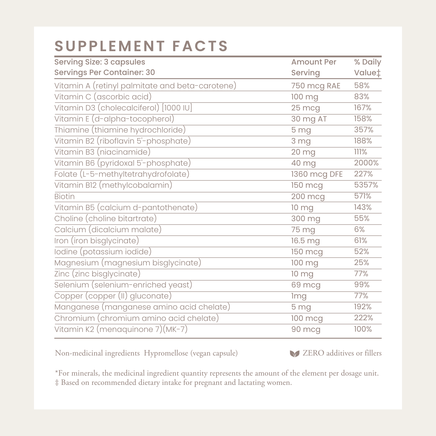 We carefully formulated our complete prenatal multivitamin to support your fertility and pregnancy. Each capsule contains 23 key nutrients to optimally nourish both mama and baby, from targeted fertility-boosting essentials like antioxidants, folate, vitamin D, and minerals to essential pregnancy nutrients like choline, iron, Vitamin K2, and B vitamins. One thing you’ll never find in our formula? Fillers.